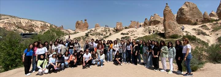 Mavigün ailesi olarak peri bacalarının yer aldığı Nevşehir ve Aksaray illerindeki doğa gezimize 13 Mayıs Cuma günü saat 21.30’da okulumuzun bahçesinden öğrencilerimizle hareket ettik. Sabaha doğru rotamızda yer alan Aksaray ilindeki Kuzucular Oteli’ne yerleştikten sonra güzel bir kahvaltıyla enerji toplayarak peri bacaları diyarı Nevşehir’e yol aldık. İsmine yabancı tacirler tarafından “Fairy Chimneys” yani peri bacaları denildiği bu bölgenin kalker yapısı sayesinde iklimsel aşındırmayla oluştuğunu rehberimizden öğrendik. Üçhisar Güvercinlik Vadisi’nde ve Göreme Esentepe Panoraması’nda yer alan peri bacalarını kuş bakışı izledik. Hacı Bektâş Velî’nin “Yetmiş iki milleti bir nazarda gör.” sözü gibi bu bölge de tüm yapaylıktan uzak insanların manevi arınma merkezi haline gelmiş.